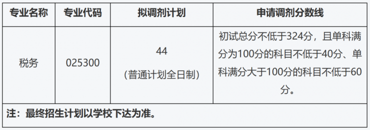 按照教育部和学校有关要求,根据我院2026年硕士研究生拟招生计划和一志愿考生拟录取情况,我院税务硕士(专业学位,普通计划全日制)有缺额,在全国范围接受调剂,现公告如下: